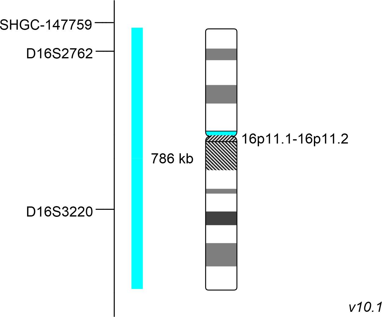 The XCE 16 DNA probe contains blue (aqua)-labeled sequences specific to a region at 16p11.1-16p11.2, located at the border of the pericentromeric and centromeric areas of chromosome 16.